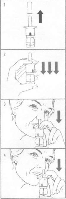 3.Den Kopf leicht nach vorne neigen und den Sprühkopf in eine Nasenöffnung so einführen, dass sich der Sprühnebel gleichmässig verteilen kann, d.h. die Düsenöffnung sollte nicht gegen die Nasenwand gerichtet sein. Die Dosierpumpe EINMAL (rasch und kräftig) herunterdrücken und wieder loslassen (s. Abb. 3). Im Fenster der Zählerscheibe erscheint die Ziffer 1.