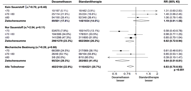 In der Dexamethason-Gruppe war die Sterblichkeit bei den Patienten, die eine invasive mechanische Beatmung erhielten (29.3% vs. 41.4%; RR: 0.64; 95%-KI: 0.51-0.81) sowie bei den Patienten, die nur zusätzlichen Sauerstoff ohne invasive mechanische Beatmung erhielten (23.3% vs. 26.2%; RR: 0.82; 95%-KI: 0.72-0.94), niedriger als in der Standardtherapiegruppe.