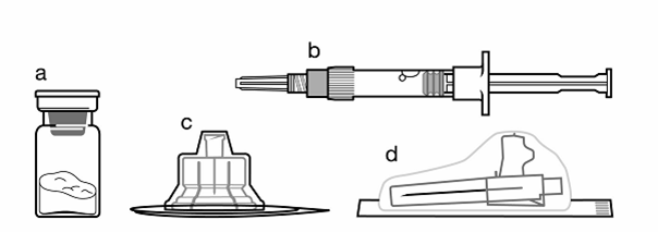 Die Sicherheitsnadel auf die Spritze schrauben. Die Fertigspritze behutsam bewegen, um eine homogene milchige Suspension zu erhalten.