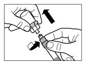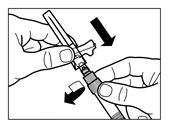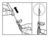 Die Fertigspritze mit der Ampulle auf den Kopf stellen und den Kolben langsam herausziehen, so dass der gesamte Inhalt aus der Ampulle in die Fertigspritze gezogen wird.