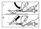 Die Nadel-Schutzvorrichtung wird mit einer Ein-Hand-Technik aktiviert: A) entweder indem man die Kerbe der Schutzvorrichtung auf eine harte Oberfläche drückt (Abbildung A) B) oder indem die Kerbe mit dem Zeigefinder nach vorne gedrückt wird. (Abbildung B)