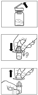 Verschlusskappe der Durchstechflasche, die Sandostatin LAR enthält, entfernen. Den Gummistopfen der Durchstechflasche mit einem Alkoholtupfer desinfizieren. Anschliessend die Deckfolie des Blisters, welcher den Adapter für die Durchstechflasche enthält, entfernen. Den Adapter NICHT aus dem Blister nehmen. Den Adapter mit dem Blister auf der Durchstechflasche positionieren. Den Adapter auf die Durchstechflasche drücken, bis er hörbar einschnappt. Nachdem der Adapter eingeschnappt ist, den Blister senkrecht nach oben wegziehen und entsorgen.