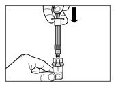 Die Verschlusskappe der Fertigspritze, die das Lösungsmittel enthält, entfernen und die Spritze auf den Adapter der Durchstechflasche schrauben. Den Kolben langsam nach unten stossen und das gesamte Lösungsmittel in die Ampulle geben, ohne die Sandostatin LAR-Trockensubstanz aufzuwirbeln.