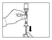 Wenn die Trockensubstanz vollständig benetzt ist, den Kolben vollständig zurück in die Fertigspritze pressen. Den Kolben gedrückt halten und die Ampulle mässig in horizontaler Richtung während mindestens 30 Sekunden kreisen. Kontrollieren, ob sich das Pulver am Boden und an der Wand der Durchstechflasche vollständig gelöst hat (es muss eine homogene, milchige Lösung entstehen). Falls nicht, muss das mässige, horizontale Kreisen während ca. 30 Sekunden wiederholt werden. ACHTUNG: Die Durchstechflasche darf nicht stark geschüttelt werden, da die Suspension sonst ausflocken und dadurch unbrauchbar werden könnte.