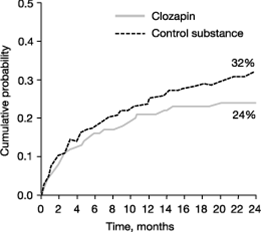 Typ 2-Ereignisse (es wurde die Suizidalität zusätzlich zu den Typ 1-Ereignissen mit mehreren Scores gemessen) traten zu 28% unter Clozapin und zu 37% unter dem anderen atypischen Neuroleptikum auf. Erfolgreiche Suizide wurden bei 5 Patienten unter Clozapin und bei 3 Patienten unter der aktiven Kontrolle beobachtet, dieser Unterschied war statistisch nicht signifikant.