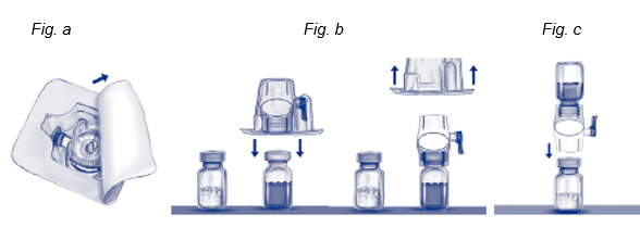 1.Der verschlossene Blister (enthält Fläschchen mit Lyophilisat und Aqua ad iniectabilia vormontiert mit einem System zur Rekonstitution) auf 15 – 25 °C bringen.