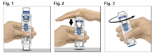 4.Das ADVATE auf eine flache Oberfläche stellen, so dass sich das Lösungsmittelfläschchen oben befindet (Fig. 1). Das Lösungsmittelfläschchen hat einen blauen Streifen. Die blaue Schutzkappe nicht entfernen, bis dies in einem späteren Schritt angewiesen wird.