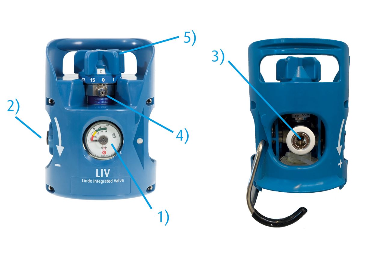 Das LIV-Ventil hat einen eingebauten Druckregler, der den Ausgangsdruck der Flasche auf 4-5 bar reduziert. Es muss daher nicht mit einem separaten Druckregler ausgestattet werden. Es hat auch ein eingebautes Inhaltsmanometer, das den aktuellen Flaschendruck anzeigt. Das LIV-Ventil enthält ein Restdruckventil, das dafür sorgt, dass ein Restgasdruck in der Flasche verbleibt und damit vor Verunreinigungen von aussen schützt.