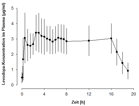 Abbildung 1: Plasmakonzentrationen (Mittelwert ± Standardabweichung) versus Zeitprofil von Levodopa bei 16stündiger Infusion von Duodopa