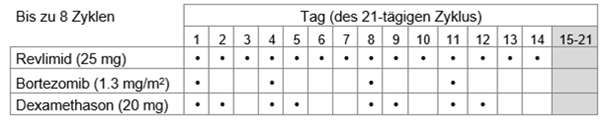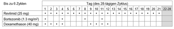 Tabelle 1: Empfohlenes Dosierungsschema für Revlimid in Kombination mit Bortezomib und Dexamethason