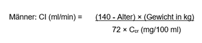Wenn nur die Serum-Kreatininwerte (Ccr) bekannt sind, kann die Kreatinin-Clearance (Cl) mit der folgenden Formel abgeschätzt werden:
