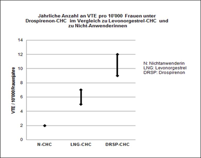 Warnhinweise und VorsichtsmassnahmenDie Anwendung eines CHC erhöht das Risiko für venöse Thromboembolien (VTE) und für arterielle Thromboembolien (ATE) im Vergleich zur Nichtanwendung. Warnhinweise und Vorsichtsmassnahmen, welche nachfolgend beschrieben werden, müssen vor jeder Verschreibung berücksichtigt werden (vgl. «Risiko für venöse Thromboembolien [VTE]» und «Risiko für arterielle Thromboembolien [ATE]»). Es ist wichtig, die Patientin auf die Informationen zu venösen und arteriellen thromboembolischen Ereignissen hinzuweisen, insbesondere auf die möglichen Symptome von VTE und ATE und die bekannten vaskulären Risikofaktoren sowie darauf, was im Falle einer vermuteten Thrombose zu tun ist (vgl. «Symptome einer VTE [tiefe Venenthrombose und Lungenembolie]» und «Symptome einer ATE»).