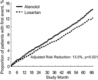 Der primäre Endpunkt war die Kombination von kardiovaskulärer Morbidität und Mortalität gemessen als Reduktion der kombinierten Ereignisse kardiovaskulärer Tod, Schlaganfall und Myokardinfarkt. Die Ergebnisse zeigten, dass die Behandlung mit Losartan im Vergleich zu Atenolol zu einer Risikoreduktion von 13,0% (p=0,021) in Bezug auf den primären zusammengesetzten Endpunkt führte (siehe Graphik 1).
