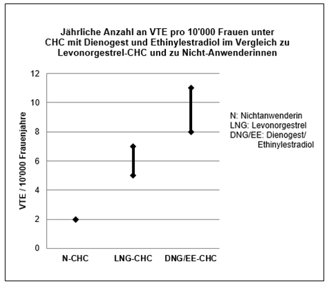 Die Anwendung jedes CHC erhöht das Risiko für VTE im Vergleich zur Nichtanwendung. Arzneimittel, die Levonorgestrel, Norgestimat oder Norethisteron enthalten, sind mit dem geringsten Risiko für eine VTE verbunden. Andere CHC, wie Valette, können ein bis zu doppelt so hohes Risiko aufweisen.