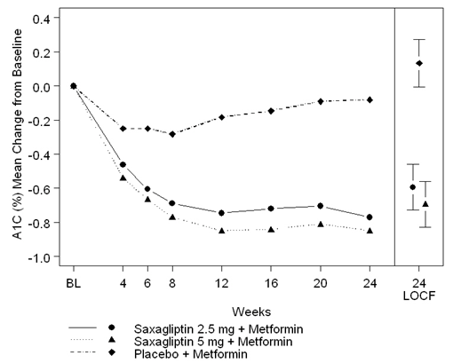 Interaktionen mit der Nahrung: Nahrung hatte bei gesunden Probanden relativ schwache Auswirkungen auf die Pharmakokinetik von Saxagliptin. Nach Verabreichung mit Nahrung (sehr fettreiche Mahlzeit) zeigte sich keine Veränderung der Cmax von Saxagliptin bzw. eine Zunahme der AUC gegenüber der Nüchterneinnahme um 27%. Die Zeit bis zum Erreichen der Cmax von Saxagliptin (tmax) war bei Einnahme mit Nahrung gegenüber der Nüchterneinnahme um etwa 0.5 Stunden verlängert. Diesen Veränderungen wurde keine klinische Bedeutung beigemessen.