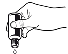 Zur Tropfenentnahme muss die Flasche auf den Kopf gedreht werden. Falls keine Tropfen herauskommen, kann leicht auf die Flasche geklopft werden, bis der Tropfenfluss startet.