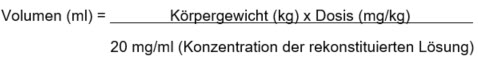 Das benötigte Volumen der Lösung ausgehend von einer Dosis von 3,6 mg Trastuzumab-Emtansin pro kg Körpergewicht ermitteln (siehe «Dosierung/Anwendung: Dosisreduktionsplan»):