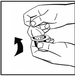7.Brechen Sie die Spritzenkappe aus Plastik von der Lösungsmittelspritze an der Perforation ab. Berühren Sie nicht die Innenseite der Kappe oder der Spritzenspitze. Wird die Lösung nicht sofort verwendet, verschliessen Sie die gefüllte Spritze mit der Spritzenkappe zur Aufbewahrung.