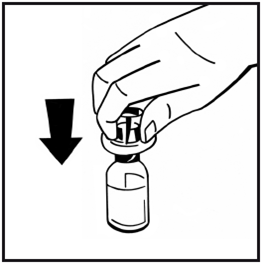5.Stellen Sie die Durchstechflasche mit dem Pulver auf eine ebene Unterlage und halten Sie sie fest. Nehmen Sie den Adapter mit seiner Verpackung und platzieren Sie den Durchstechflaschen-Adapter mittig über dem Gummistopfen der Durchstechflasche mit dem Pulver. Drücken Sie die Adapterverpackung mit dem Adapter kräftig auf, bis der Adapterdorn den Gummistopfen durchdringt. Dabei rastet der Adapter auf der Durchstechflasche ein.