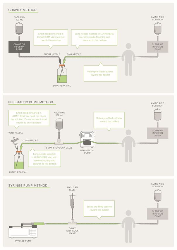 Die Infusion der Aminosäurenlösung und von Lutathera/Lutathera CA über einen separaten venösen Zugang in je einem Arm des Patienten ist die bevorzugte Methode. Wenn jedoch zwei intravenöse Zugänge aufgrund eines schlechten Venenzugangs oder aufgrund von Präferenzen in der Einrichtung/im Spital nicht möglich sind, kann die Infusion der Aminosäurenlösung und von Lutathera/Lutathera CA über denselben Zugang über einen Dreiwegehahn erfolgen, wobei die Flussrate und die Offenhaltung des Venenzugangs zu überwachen ist. Die Dosis der Aminosäurenlösung sollte nicht verringert werden, auch wenn eine reduzierte Dosis Lutathera/Lutathera CA verabreicht wird.