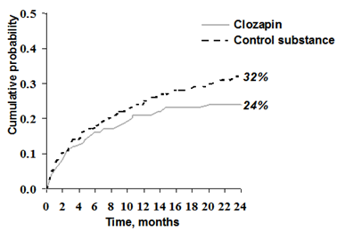 In dieser Studie wurden 980 Patienten in randomisierter Weise der Behandlung mit Clozapin oder der Behandlung mit der aktiven Kontrollsubstanz zugeordnet; 62% der Patienten litten an einer Schizophrenie und 38% an einer schizoaffektiven Störung. Aus statistischen Gründen wurde die Suizidalität mit zwei Ereignismessungen erfasst (Typ 1- und Typ 2-Ereignisse). Nach 2 Jahren war die kumulative Wahrscheinlichkeit des Auftretens eines Typ 1-Ereignisses (d.h. eindeutige Suizidversuche, vollendete Suizide oder Spitaleinweisungen, um einen Suizid zu verhindern), bei den mit Clozapin behandelten Patienten geringer (24%), als bei den mit dem anderen atypischen Neuroleptikum behandelten Patienten (32%):