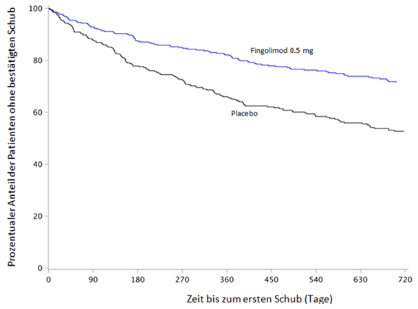 In Monat 12 der Verlängerungsstudie hatte sich bei den Patienten, die in der Hauptstudie Interferon beta-1a i.m. erhalten hatten und dann auf 0.5 mg Fingolimod umgestellt wurden, die ARR relativ um 30% reduziert (ARR-Verhältnis=0.70, p=0.06). Bei Patienten, die bereits in der Hauptstudie mit 0.5 mg Fingolimod behandelt worden waren, blieb die ARR über die Haupt- und Verlängerungsphase hinweg niedrig (ARR=0.18 bis Monat 24).