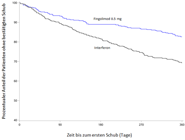 Der primäre Endpunkt, die auf das Jahr umgerechnete Schubrate (Annualized Relapse Rate, ARR) war bei den Patienten, die mit Fingolimod behandelt wurden, statistisch signifikant niedriger als bei denen, die Interferon beta-1a erhielten (relative Reduktion der ARR um 81.9%). Der wichtigste sekundäre Endpunkt, die auf das Jahr umgerechnete Anzahl der neu aufgetretenen bzw. neu vergrösserten T2-Läsionen bis Monat 24, war ausserdem bei den Patienten, die mit Fingolimod behandelt wurden, statistisch signifikant niedriger als bei denen, die Interferon beta-1a erhielten, ebenso wie die Anzahl der vorhandenen Gd-anreichernden T1-Läsionen pro Scan bis Monat 24. Durch Fingolimod wurde zudem die auf das Jahr umgerechnete Hirnatrophie- Rate von der Baseline bis Monat 24 statistisch signifikant reduziert. Eine zusätzliche Post-hoc-Analyse zeigte, dass durch Fingolimod im Vergleich mit Interferon beta-1a der Zeitraum bis zum Einsetzen einer 3-monatigen bestätigten Progression der Behinderung statistisch signifikant verlängert wurde. Die Ergebnisse dieser Studie sind in Tabelle 5, Abbildung 4 und Abbildung 5 dargestellt.