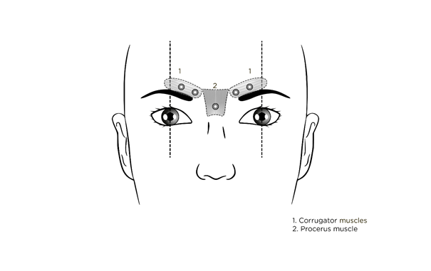 Die empfohlenen Injektionspunkte für Glabellafalten sind unten beschrieben.