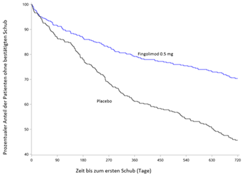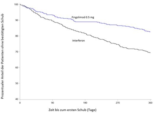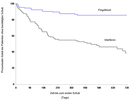 Der primäre Endpunkt, die auf das Jahr umgerechnete Schubrate (Annualized Relapse Rate, ARR) war bei den Patienten, die mit Fingolimod behandelt wurden, statistisch signifikant niedriger als bei denen, die Interferon beta-1a erhielten (relative Reduktion der ARR um 81,9%). Der wichtigste sekundäre Endpunkt, die auf das Jahr umgerechnete Anzahl der neu aufgetretenen bzw. neu vergrösserten T2-Läsionen bis Monat 24, war ausserdem bei den Patienten, die mit Fingolimod behandelt wurden, statistisch signifikant niedriger als bei denen, die Interferon beta-1a erhielten, ebenso wie die Anzahl der vorhandenen Gd-anreichernden T1-Läsionen pro Scan bis Monat 24. Durch Fingolimod wurde zudem die auf das Jahr umgerechnete Hirnatrophie- Rate von der Baseline bis Monat 24 statistisch signifikant reduziert. Eine zusätzliche Post-hoc-Analyse zeigte, dass durch Fingolimod im Vergleich mit Interferon beta-1a der Zeitraum bis zum Einsetzen einer 3-monatigen bestätigten Progression der Behinderung statistisch signifikant verlängert wurde. Die Ergebnisse dieser Studie sind in Tabelle 5, Abbildung 4 und Abbildung 5 dargestellt.