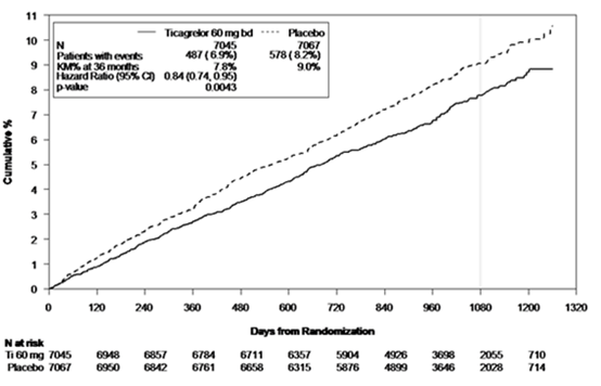 Im Vergleich zu ASS allein reduzierte Ticagrelor 60 mg zweimal täglich signifikant den primären kombinierten Endpunkt aus kardiovaskulärem Tod, Myokardinfarkt und Schlaganfall. Zur Reduktion des primären kombinierten Endpunkts trug jede der einzelnen Komponenten bei (kardiovaskulärer Tod 17 % RRR, Myokardinfarkt 16 % RRR, Schlaganfall 25 % RRR).