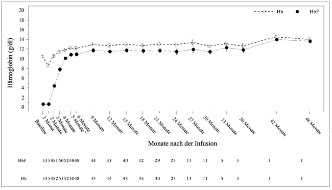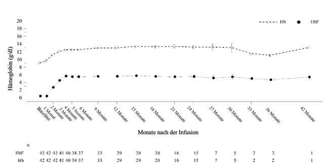 Bereits im 3. Monat nach der Infusion von Casgevy wurde ein Anstieg des mittleren (SD) Gesamt-Hb-Spiegels beobachtet, der bis zum 6. Monat weiter auf 12,5 (1,8) g/dl anstieg und danach erhalten blieb.