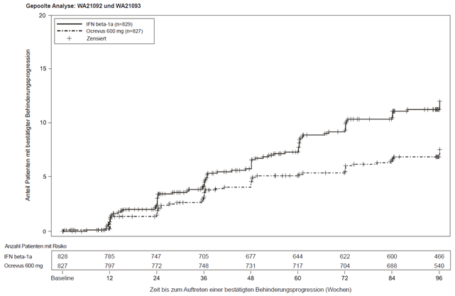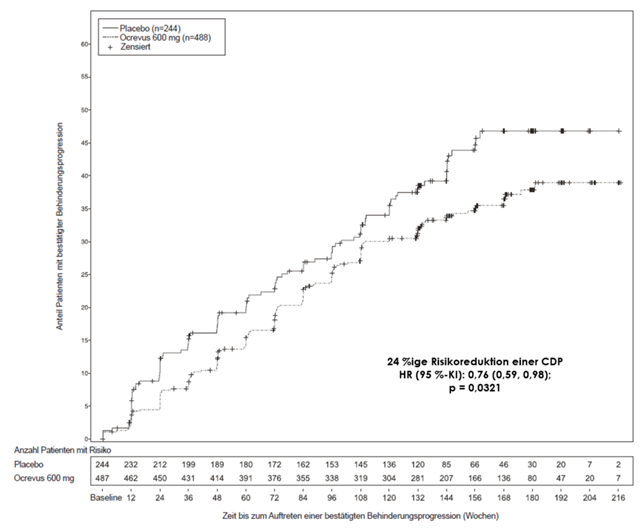 In der verlängerten Kontrollperiode (Extended Controlled Period [ECP]), die eine doppelt verblindete Behandlung und ca. 9 zusätzliche Monate kontrollierte Nachbeobachtung vor der Fortsetzung in der Open-Label-Extension (OLE) oder bis zum Abbruch der Studienbehandlung beinhaltet, wurden Post-hoc-Analysen durchgeführt. Der Anteil der Patienten mit einer 24-wöchigen bestätigten Behinderungsprogression von EDSS ≥ 7,0 (24W-CDP von EDSS ≥ 7,0; Zeit bis zur Rollstuhlpflicht) betrug 9,1 % in der Placebo-Gruppe im Vergleich zu 4,8 % in der Ocrevus-Gruppe in Woche 144, was zu einer 47 %igen Risikoreduktion der Zeit bis zur Rollstuhlpflicht (HR: 0,53, [0,31; 0,92]) während der ECP führte. Da diese Ergebnisse explorativer Natur waren und Daten nach Entblindung einschlossen, sollten diese Ergebnisse mit Vorsicht interpretiert werden.