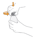 3. Entfernen Sie die kindersichere Schutzkappe, indem Sie sie herunterdrücken und gegen den Uhrzeigersinn drehen.
