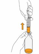 5. Drehen Sie die Flasche vorsichtig auf den Kopf und ziehen Sie am Kolben, um Ihre Dosis abzumessen. Mit der Spitze nach oben muss die Oberseite des schwarzen Stopfens mit Ihrer verschriebenen Dosis übereinstimmen. ·Wenn grosse Luftblasen in der Spritze erscheinen, drücken Sie das Arzneimittel zurück in die Flasche und ziehen Sie Ihre Dosis erneut auf. Machen Sie das so lange, bis keine Luftblasen mehr zu sehen sind. Falls noch kleine Luftblasen zu sehen sind, ist das in Ordnung.