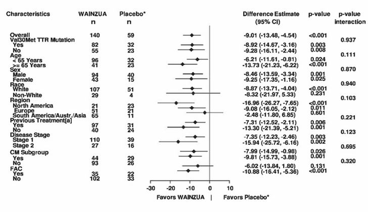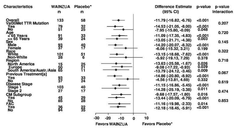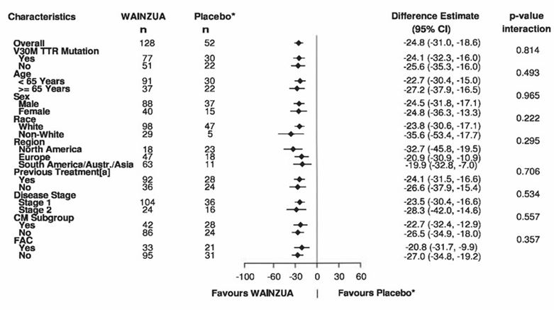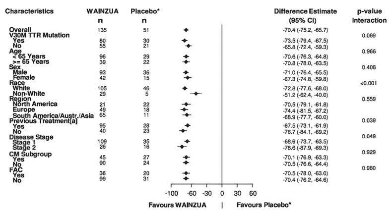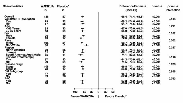 Sowohl in Woche 35 als auch in Woche 65/66 zeigten Patienten unter WAINZUA ähnliche Verbesserungen gegenüber Placebo in Bezug auf die Reduktion der TTR-Serumkonzentration, den kombinierten mNIS+7- und den Norfolk QoL-DN-Gesamtscore in allen Subgruppen einschliesslich Alter, Geschlecht, Ethnie, Region, Val30Met-Mutationsstatus, Kardiomyopathie-Status, Baseline-FAC-Diagnose und Krankheitsstadium (Abbildungen 1a und b, 7a und b sowie 8a und b).