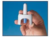 2. Den Nasenspray wie abgebildet in die Hand nehmen. Vorsicht: Der Nasenspray enthält nur eine einzelne Dosis und die blaue Pumpvorrichtung kann nur einmal betätigt werden. Falls die Pumpvorrichtung vor der eigentlichen Applikation betätigt wird, ist die gesamte Dosis verloren.