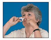 5. Den Nasenspray aus dem Nasenloch entfernen. Den Kopf aufrecht halten und für 10 - 20 Sekunden sanft durch die Nase ein- und durch den Mund ausatmen. Damit können Sie einem Flüssigkeitsverlust vorbeugen.