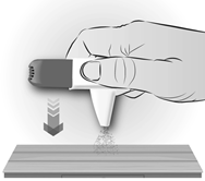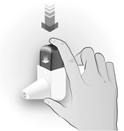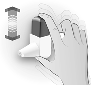 Schritt 2: LADEN («KLICKEN») • Halten Sie den Inhalator weiterhin senkrecht zwischen Daumen und Zeigefinger. • Drücken Sie den Inhalator zwischen Daumen und Zeigefinger einmal kräftig zusammen, bis Sie ein Klicken hören. Lassen Sie ihn danach in die Ausgangsposition zurückgleiten. Dadurch wird eine Dosis freigesetzt. • Betätigen Sie den Inhalator nur einmal.