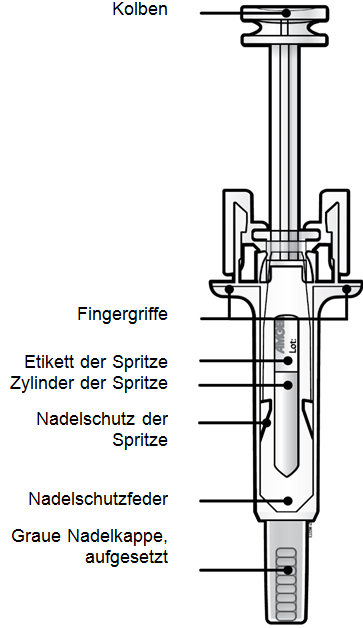 Entfernen Sie die graue Nadelkappe nicht von der Fertigspritze, bevor Sie für die Injektion bereit sind.