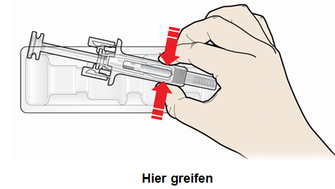 Öffnen Sie den Einsatz, indem Sie die Abdeckung abziehen. Greifen Sie den Nadelschutz der Fertigspritze, um die Fertigspritze aus dem Einsatz zu entnehmen.