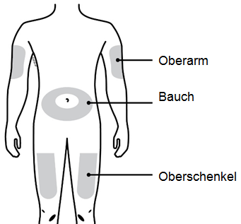 ·Die Vorderseite Ihres Oberschenkels ·Den Bauch, mit Ausnahme eines 5 cm-Bereiches um Ihren Bauchnabel herum ·Die Rückseite des Oberarms (nur, wenn eine andere Person Ihnen die Injektion gibt)