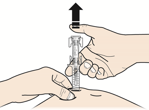 LÖSEN Sie Ihren Daumen. Anschliessend HEBEN Sie die Spritze von der Haut ab.