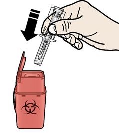 Entsorgen Sie die gebrauchte Fertigspritze und andere Materialien in einem durchstichsicheren Behälter.