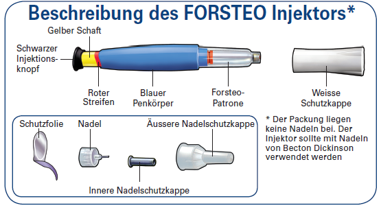 Die Injektionslösung von Forsteo steht Ihnen in einem Injektor zur Verfügung. Der Injektor darf nur zu Ihrer Behandlung und nie zur Behandlung weiterer Patienten verwendet werden. Verwenden Sie auch nicht den Injektor einer anderen Person, da gegebenenfalls mittels dem Injektor Erkrankungen zwischen Patienten übertragen werden könnten. Ihr Arzt bzw. Ihre Ärztin, das Pflegepersonal oder Ihr Apotheker bzw. Ihre Apothekerin wird Ihnen genau erklären, wie der Forsteo-Injektor zu bedienen ist. Zu Ihrer eigenen Information über den Gebrauch des Forsteo-Injektors sollen Sie ebenfalls vor Behandlungsbeginn die Bedienungsanleitung sorgfältig lesen. Für den Fall, dass neue Informationen verfügbar sind, lesen Sie bitte Bedienungsanleitung und Patienteninformation jedes Mal, nachdem Sie eine neue Packung erhalten haben.