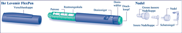 Verwenden Sie den Pen nicht, ohne eine gründliche Schulung von Ihrem Arzt bzw. Ihrer Ärztin oder dem medizinischen Fachpersonal erhalten zu haben. Beginnen Sie damit, Ihren Pen zu überprüfen, um sicherzustellen, dass er Levemir 100 Einheiten/ml enthält. Dann schauen Sie sich die Abbildungen des Levemir FlexPens an, um die verschiedenen Teile Ihres Pens und der Nadel kennenzulernen.