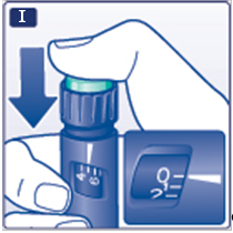 I Verabreichen Sie sich die Dosis, indem Sie den Druckknopf ganz hineindrücken bis der Dosiszeiger auf «0» steht. Achten Sie darauf, während der Injektion auf den Druckknopf zu drücken.