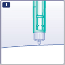 J Halten Sie den Druckknopf nach der Injektion ganz hineingedrückt, bis die Nadel aus der Haut gezogen wurde.