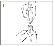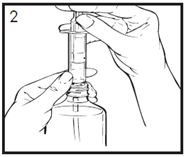 3. Halten Sie die Flasche und die Spritze mit einer Hand fest und ziehen Sie mit der anderen Hand die vorgeschriebene Dosis auf, indem Sie den Kolben der Spritze nach oben ziehen. HINWEIS: Das Arzneimittel fliesst nur dann in die Spritze, wenn Sie die Flasche aufrecht halten (Abbildung 2).