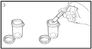 4. Ziehen Sie die Spritze aus der Flaschenöffnung heraus. Entleeren Sie das Arzneimittel aus der Spritze in einen der mitgelieferten Dosierbecher, indem Sie auf den Kolben der Spritze drücken (Abbildung 3). Wiederholen Sie diese Schritte für den zweiten Dosierbecher. Geben Sie anschliessend etwa 60 ml Wasser in jeden Dosierbecher (60 ml sind etwa 4 Esslöffel).
