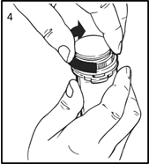 5. Setzen Sie die mitgelieferten Verschlusskappen auf die Dosierbecher und drehen Sie jede Verschlusskappe im Uhrzeigersinn (d.h. nach rechts), bis sie hörbar einrastet und kindersicher verschlossen ist (Abbildung 4). (Vorsicht: Da die Verschlusskappe des Dosierbechers rückdrehbar ist, ist erst nach dem Klickgeräusch sichergestellt, dass die Kappe kindersicher verschlossen ist). Spülen Sie die Spritze mit Wasser aus.